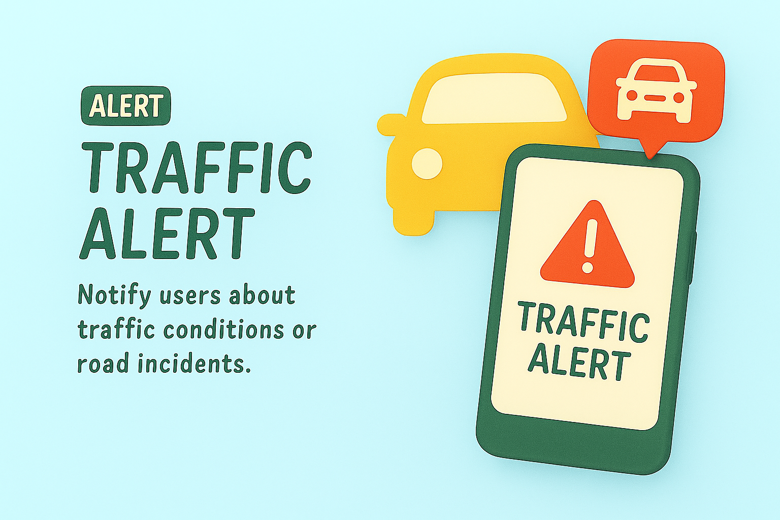 /Collection: /by davooda/Type: PNG/A modern digital graphic illustrating a traffic alert notification on a smartphone, designed with a playful style featuring a car icon and vibrant colors. Ideal for apps or informational materials about road conditions.
