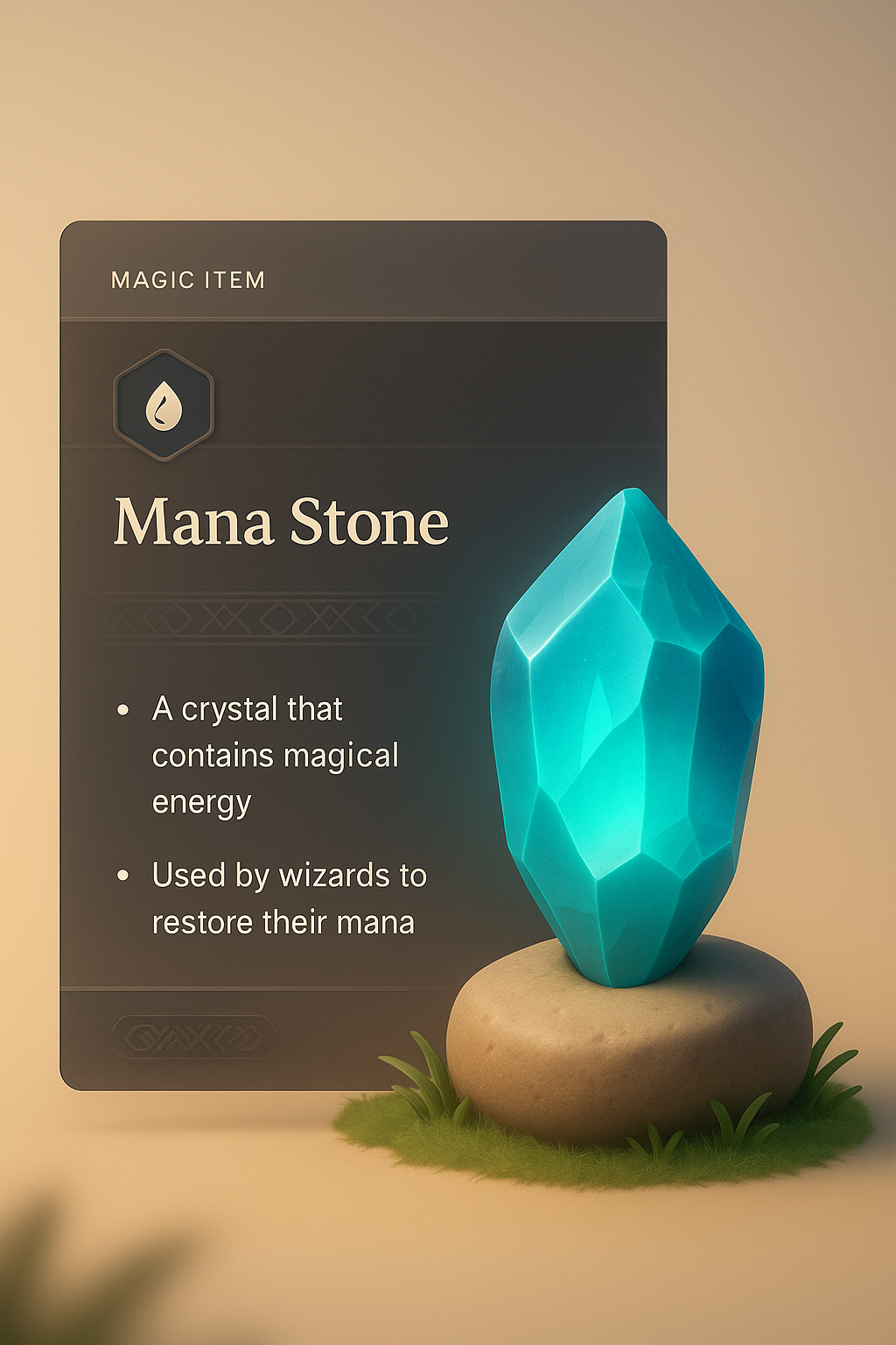 /Collection: /by davooda/Type: PNG/A captivating 3D illustration of a mana stone, featuring a stylish informational panel. The design showcases the crystal's magical essence, set on a smooth background.