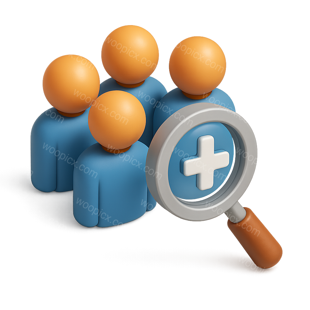 /Premium/Collection: /by davooda/Type: PNG/A stylized 3D icon featuring a group of four people with orange heads and blue bodies, accompanied by a magnifying glass in a three-quarter isometric view.