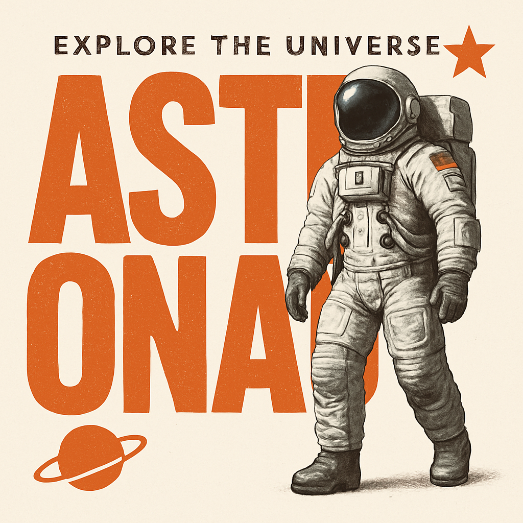 /Collection: /by davooda/Type: PNG/A vintage-inspired illustration of an astronaut walking, emphasizing space exploration. The design features retro typography and a planetary motif, suitable for educational or promotional uses.