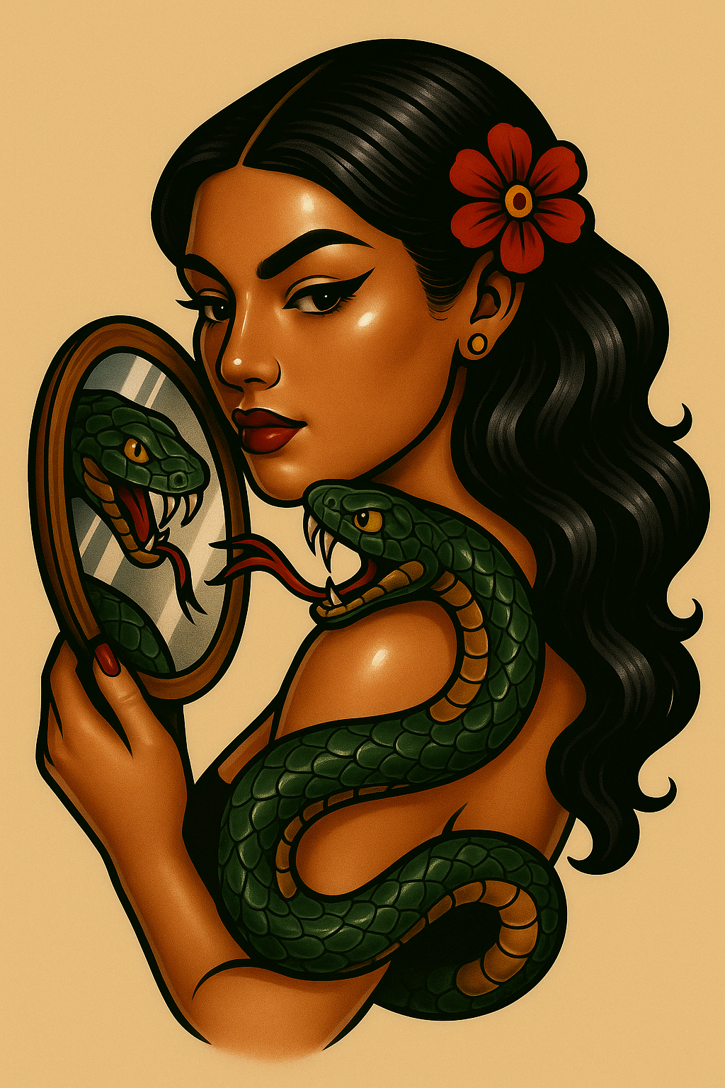 /Collection: /by davooda/Type: PNG/A stylized illustration featuring a girl with long, dark hair holding a mirror. A green snake is intertwined with her arm, reflecting in the mirror. The background is a soft beige tone, enhancing the glossy, tattoo-like aesthetic.