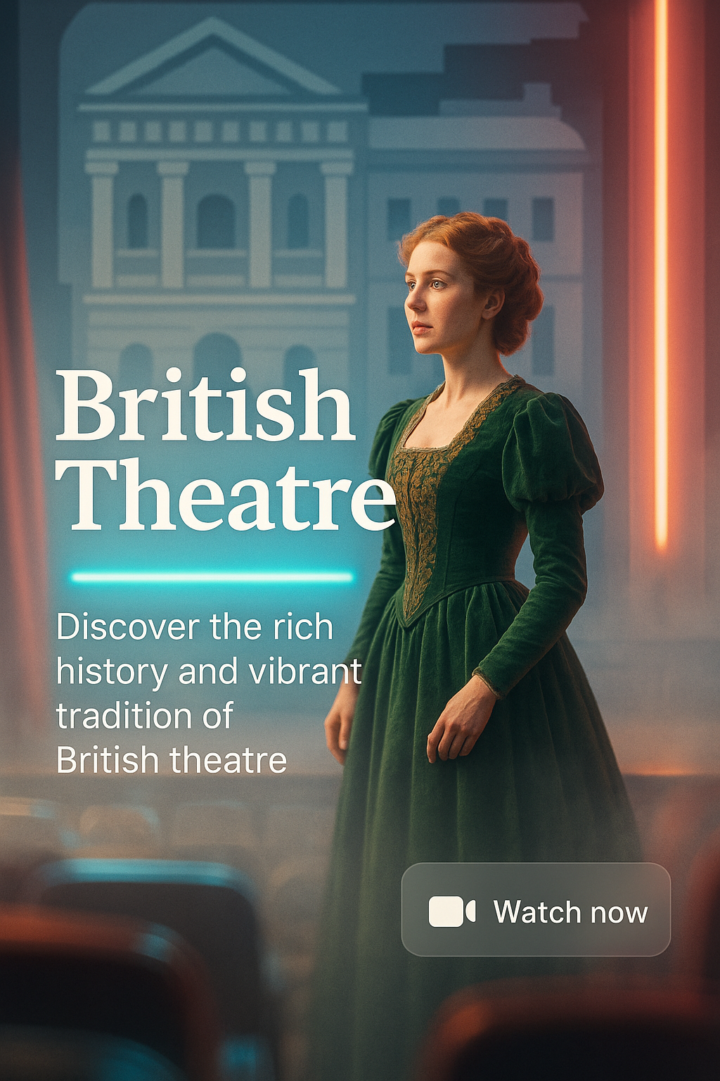 An engaging promotional image featuring a woman in a historical costume, designed to attract viewers to explore the rich history of British theatre. Ideal for digital marketing.