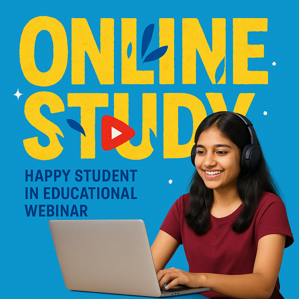 /Collection: /by davooda/Type: PNG/Vibrant promotional graphic showcasing a happy student participating in an online educational webinar. Ideal for online learning platforms and educational marketing.