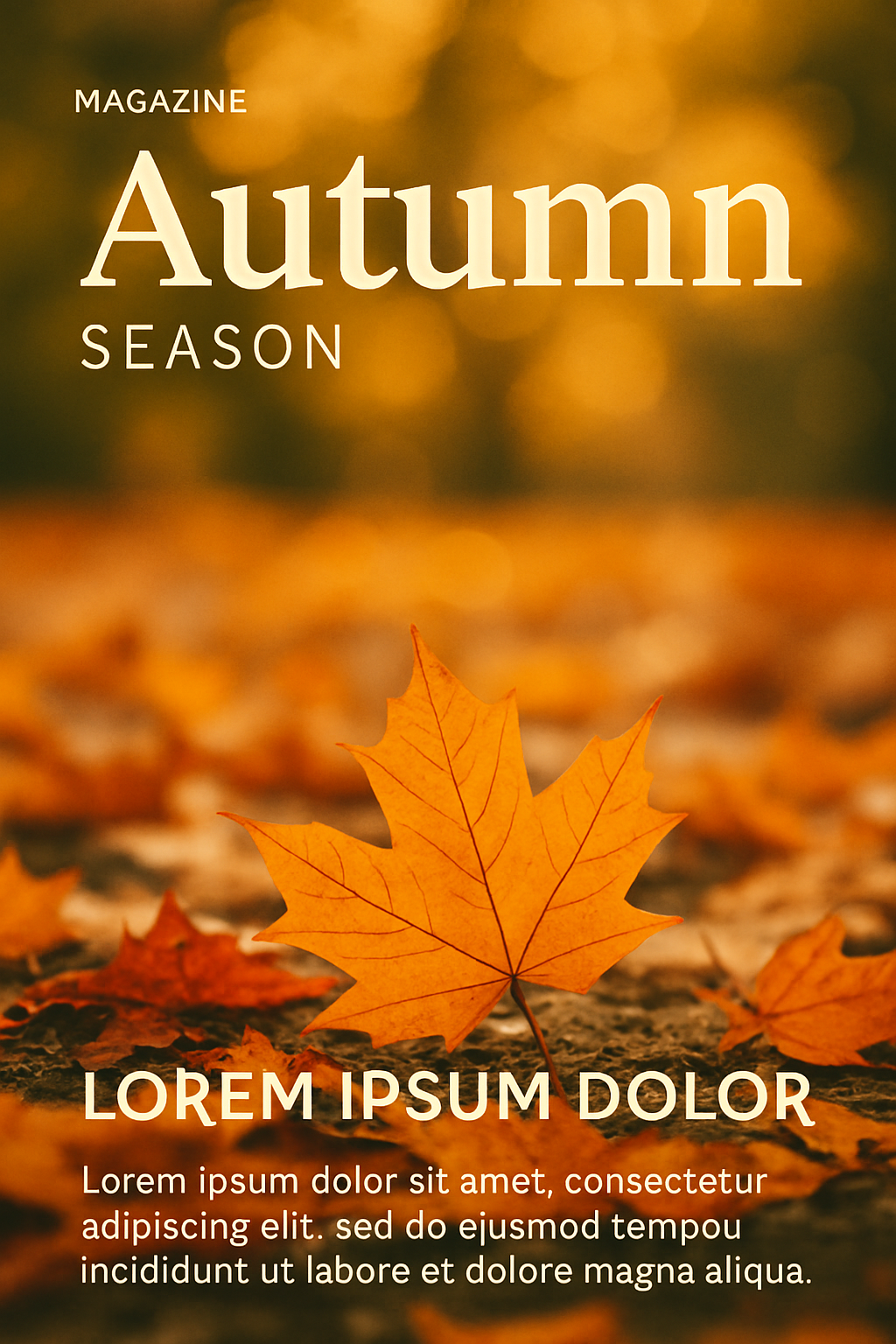 This magazine cover design showcases an autumn theme with vibrant leaf imagery, perfect for seasonal publications. The elegant typography adds a touch of sophistication.