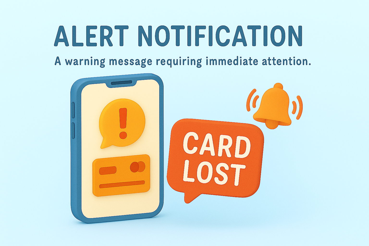 A colorful 3D graphic depicting an alert notification about a lost card, featuring a smartphone and notification icons. Ideal for digital content on security and card services.