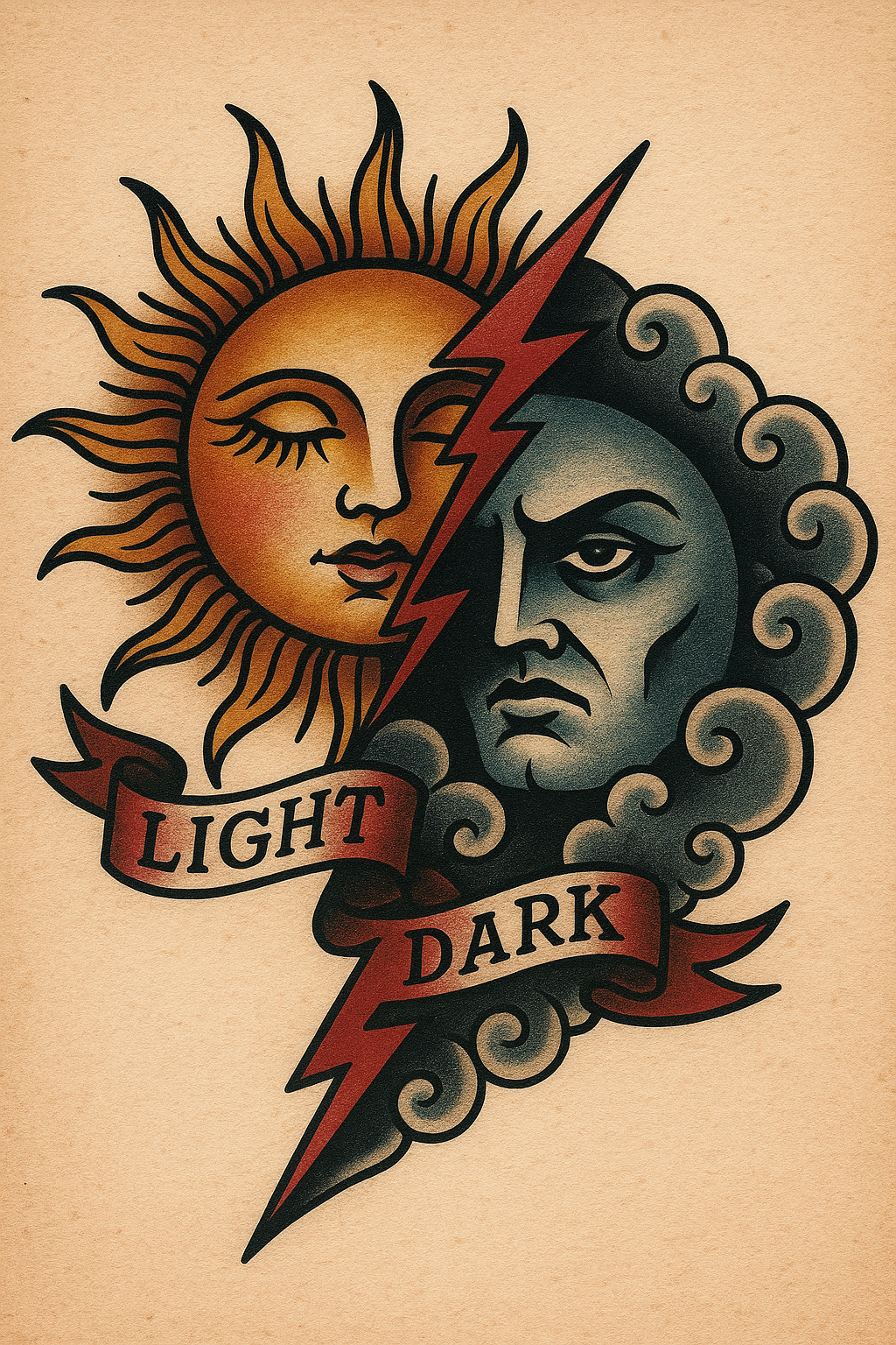A vibrant tattoo design featuring a sun and moon split by a lightning bolt, showcasing the themes of light and darkness on a beige background.