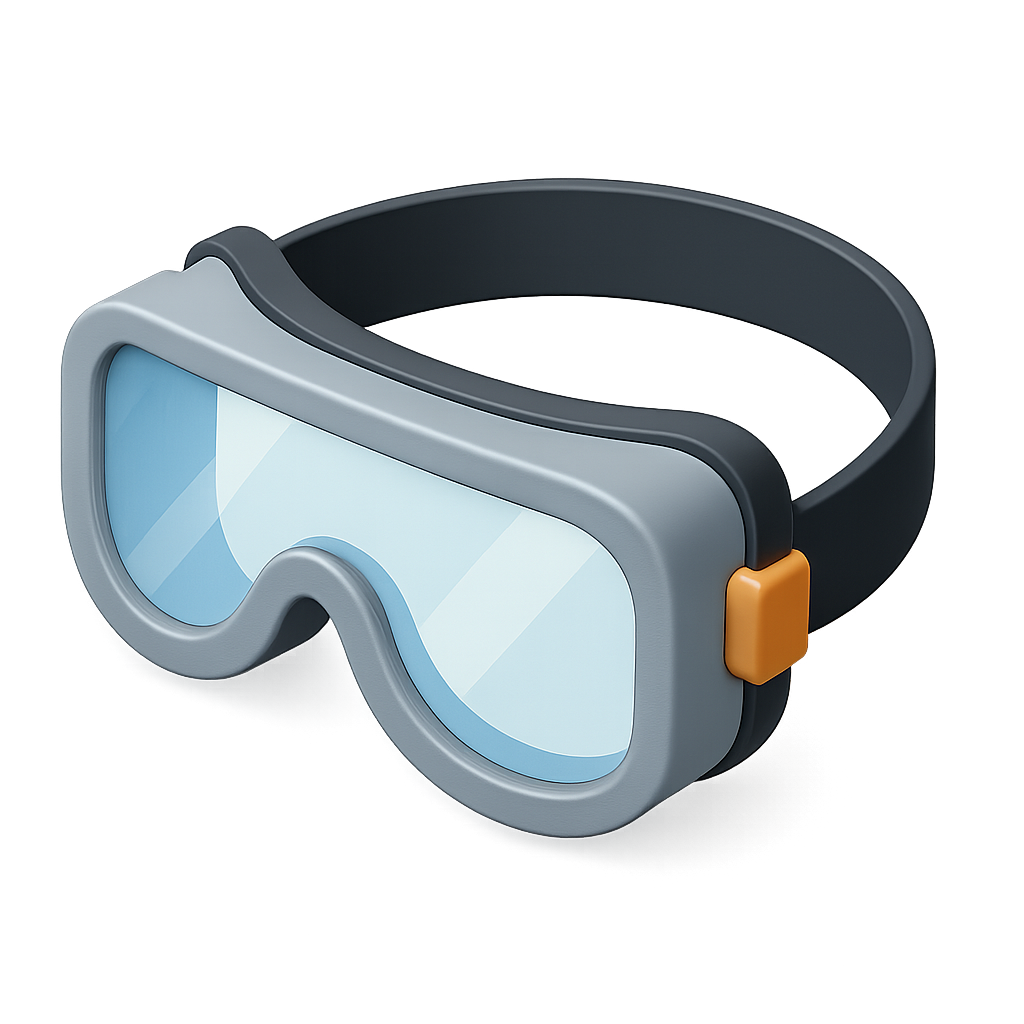 A sleek 3D icon of safety goggles featuring a strap. The goggles are designed in a three-quarter view with a transparent background, showcasing a modern, volumetric style.