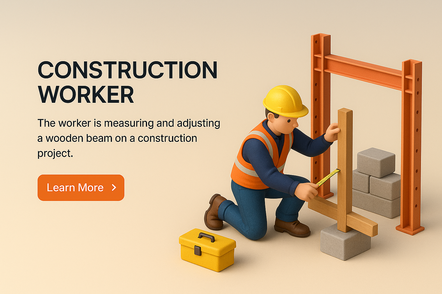 A detailed 3D illustration showing a construction worker measuring a wooden beam on a construction site, with a gradient background and clear text elements.