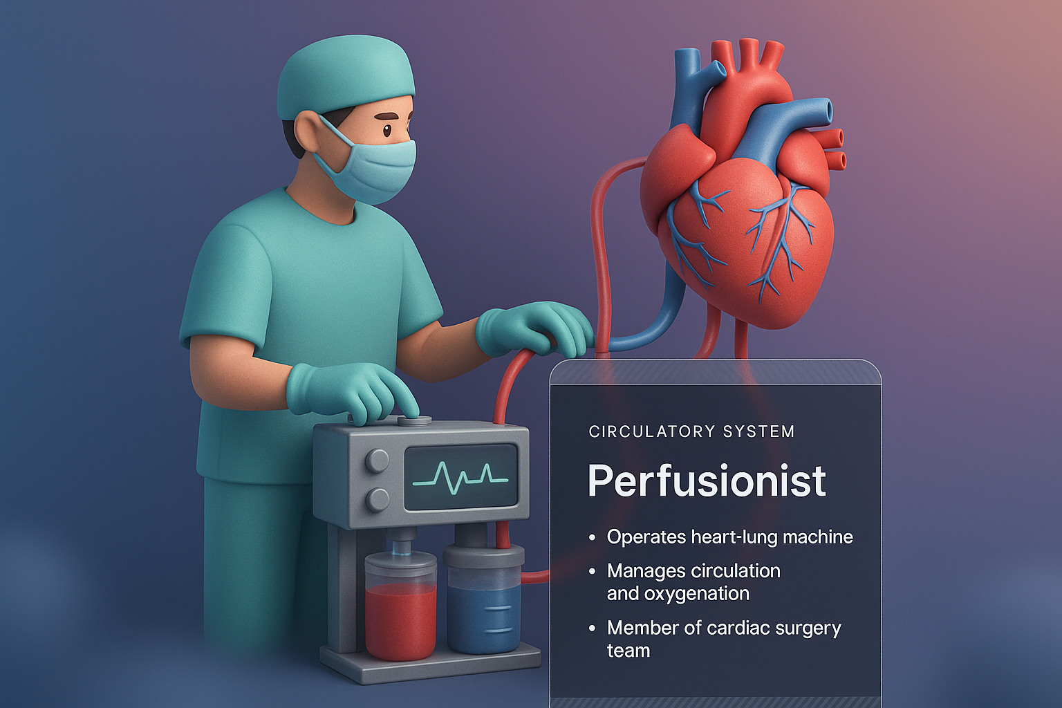 /Collection: /by davooda/Type: PNG/A detailed 3D illustration depicting a perfusionist operating a heart-lung machine. The scene integrates a heart model, with a dark translucent panel containing key information about the perfusionist's role.