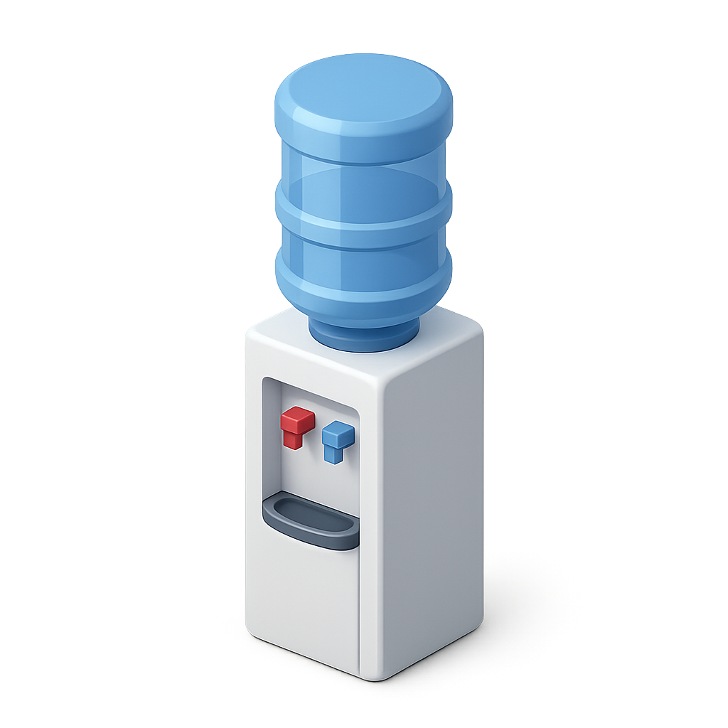 A sleek and modern 3D water cooler with a blue bottle on top, featuring a white base and red and blue buttons. The isometric view enhances its volumetric appearance.