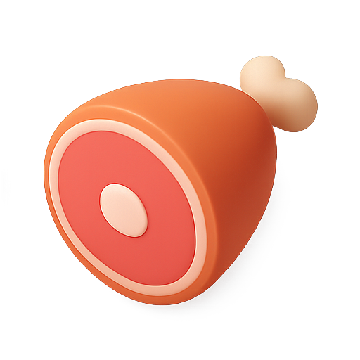 A playful, stylized illustration of a ham with a bone, featuring vibrant colors and a smooth, rounded design. Ideal for food-related graphics or playful branding.
