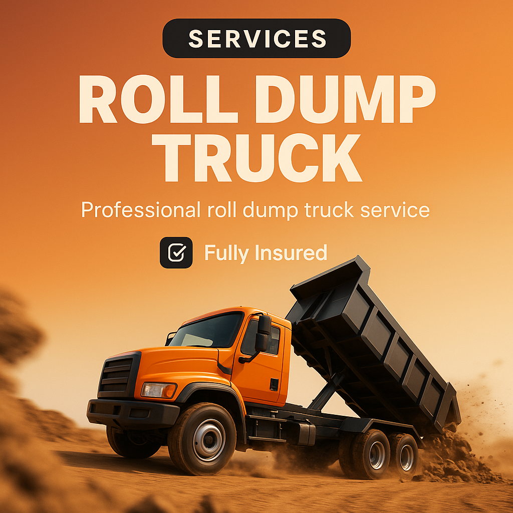 Vibrant promotional image showcasing a roll dump truck against a dramatic background, highlighting a professional service ideal for construction and logistics marketing.