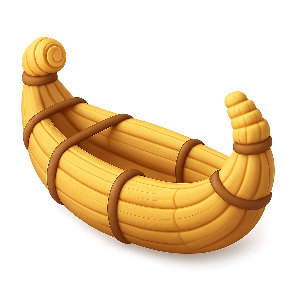 A vibrant 3D icon of a reed boat, showcasing a unique design with a three-quarter view. The boat features a yellow body with brown bindings, set against a soft gradient background.