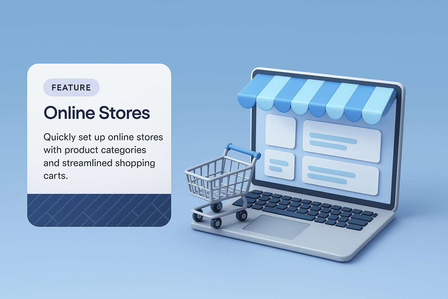 /Collection: /by davooda/Type: PNG/A vibrant 3D illustration featuring a shopping cart beside a laptop on a soft blue background. The laptop displays online store features, enhancing the online shopping concept.