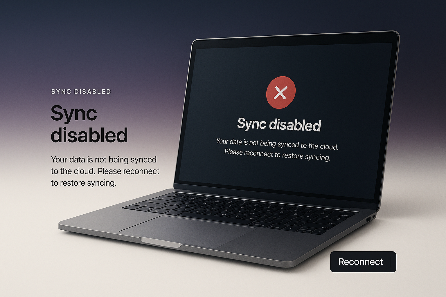 /Collection: /by davooda/Type: PNG/A sleek laptop displays a 'Sync Disabled' notification with a clear call to action. The background features a subtle gradient, enhancing readability and focus on the message.