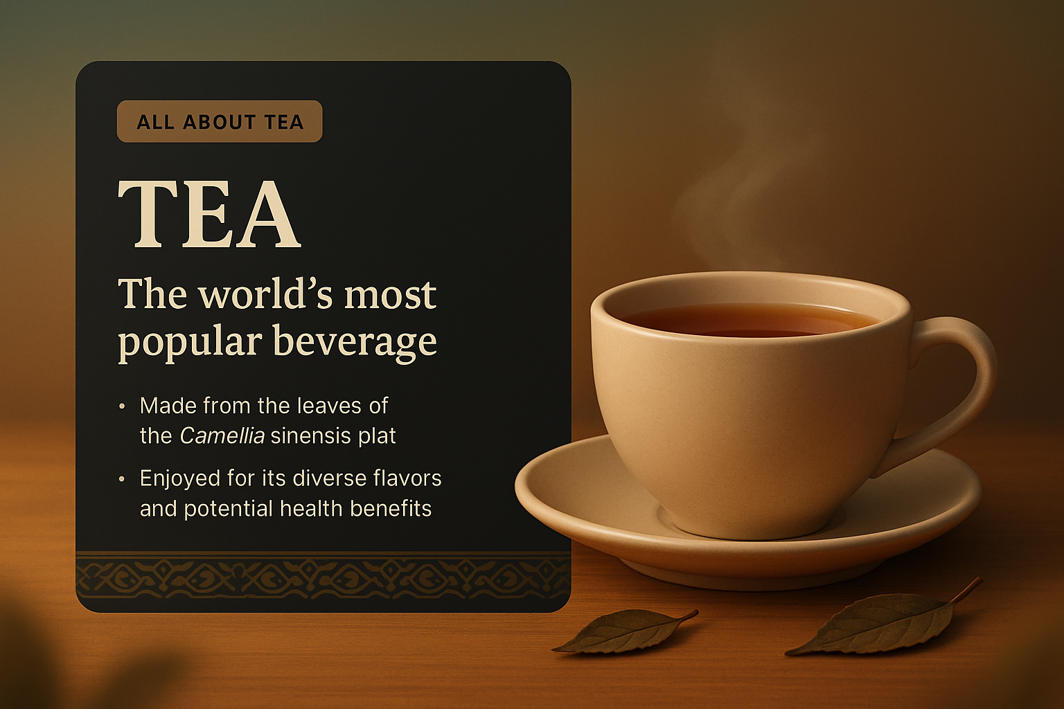 A visually appealing 3D illustration of a tea cup on a saucer, accompanied by a dark information block detailing tea's popularity and health benefits. The background features a smooth gradient.