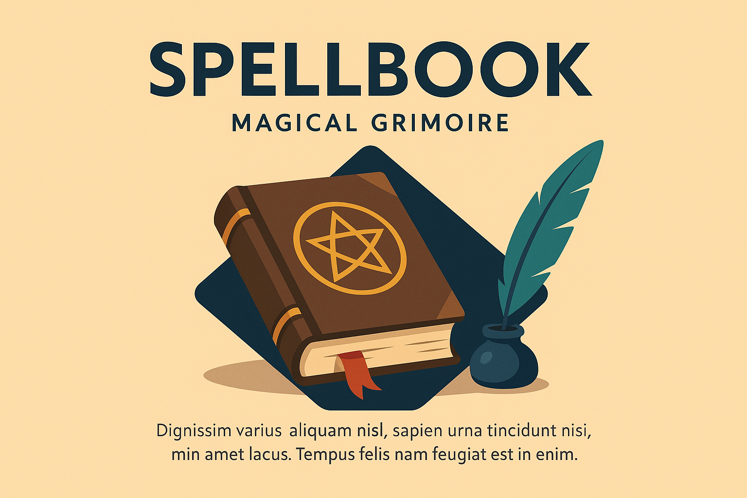 A visually appealing spellbook design featuring a geometric shape background, a classic book with a pentagram, and a feather quill, all in a balanced composition.