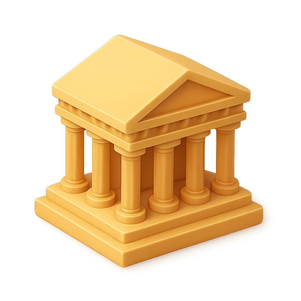 A stylized 3D representation of a Greek temple, featuring a triangular roof and classic columns. The icon has a golden hue, enhancing its visual appeal.