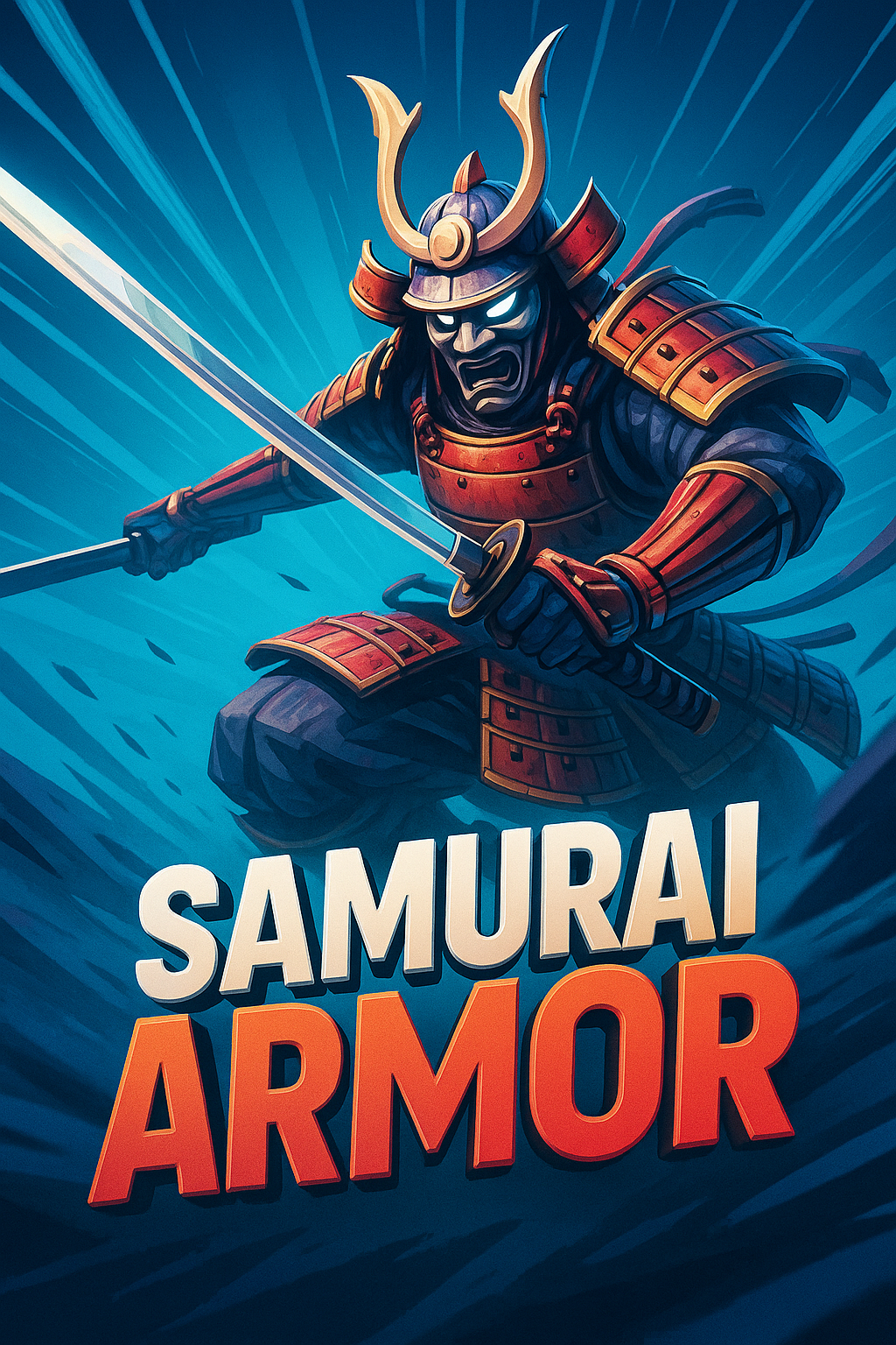 /Collection: /by davooda/Type: PNG/A striking illustration of a samurai in dynamic armor, wielding a sword. The background features vibrant blue gradients with energetic lines radiating outward, enhancing the sense of motion.