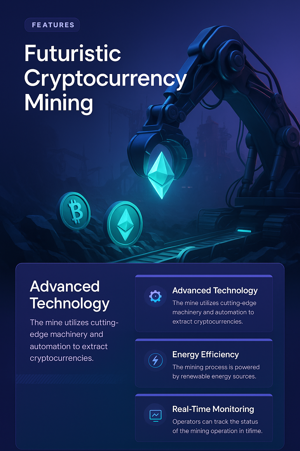 A sleek digital illustration of a futuristic cryptocurrency mining setup featuring advanced machinery, glowing coins, and a deep gradient background.