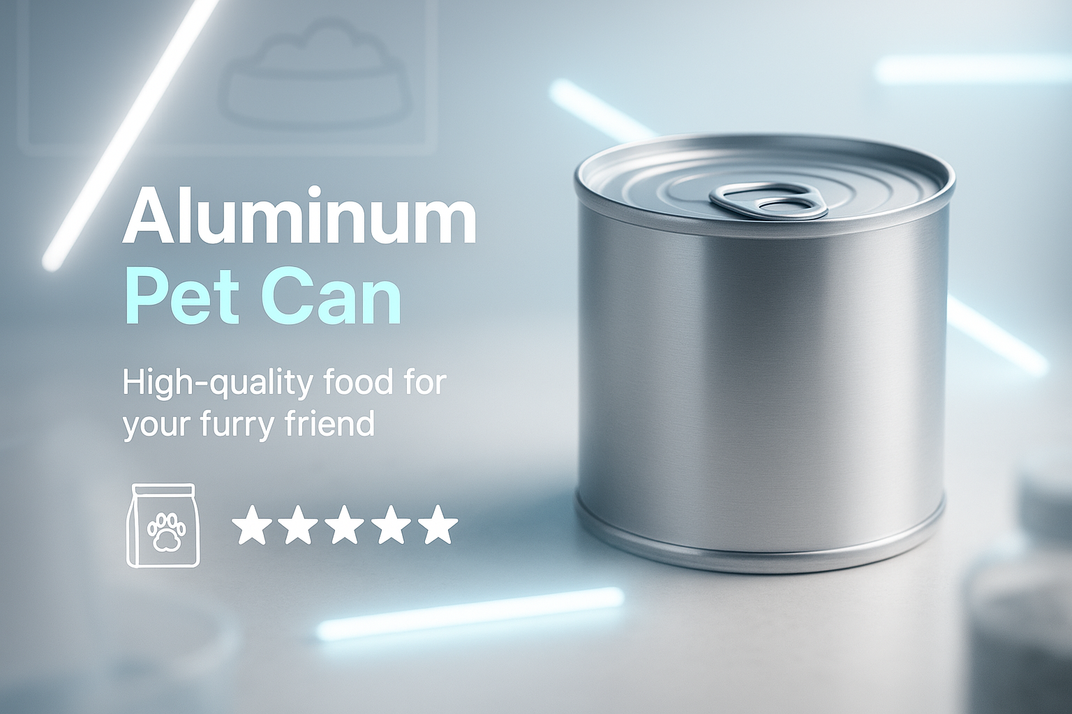 Stylish product mockup of an aluminum pet food can, showcasing high-quality branding elements and a sleek, modern aesthetic suitable for pet food marketing.