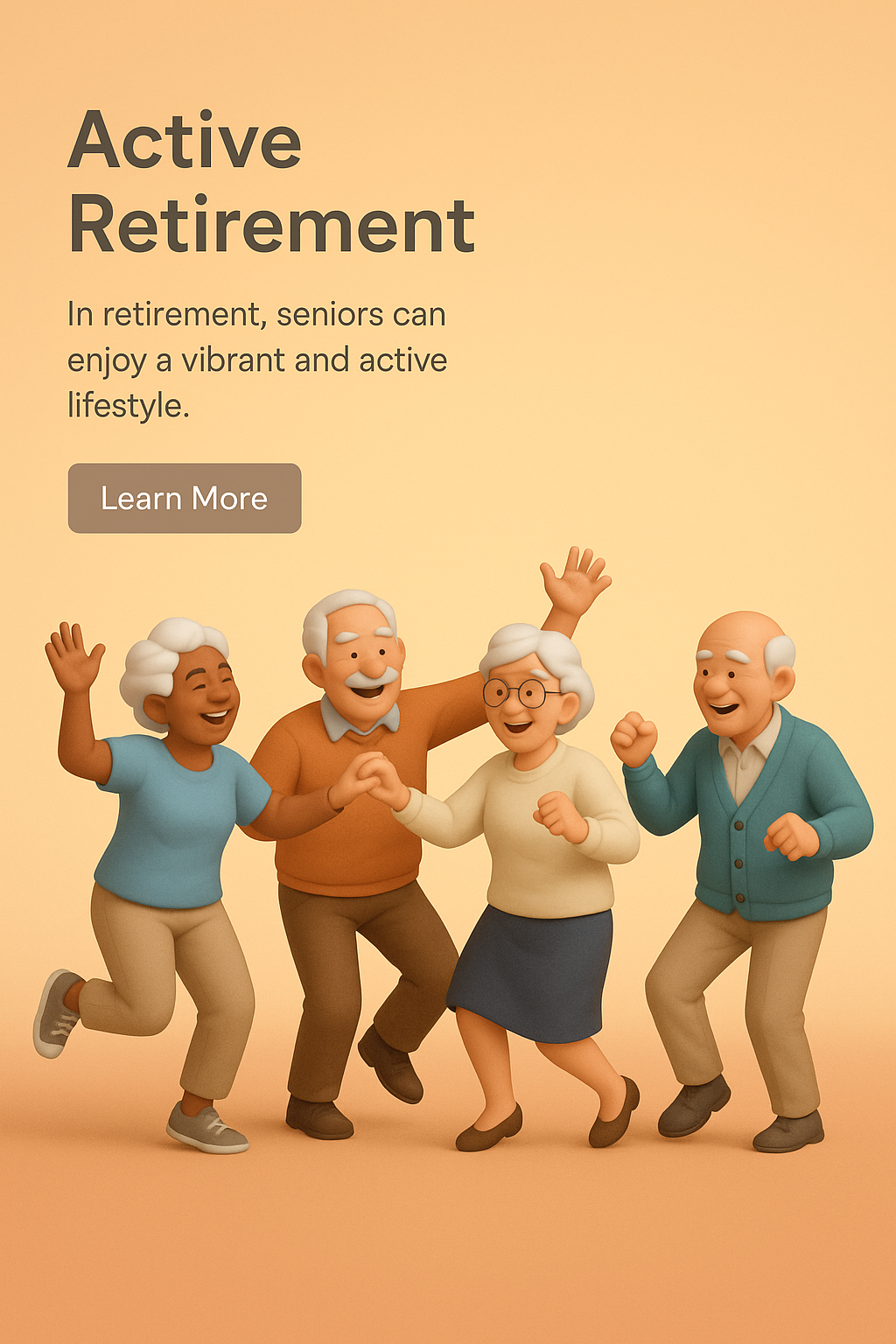 /Collection: /by davooda/Type: PNG/A vibrant 3D illustration of a joyful group of seniors dancing together, showcasing their active lifestyle and companionship in retirement. The background features a smooth gradient.