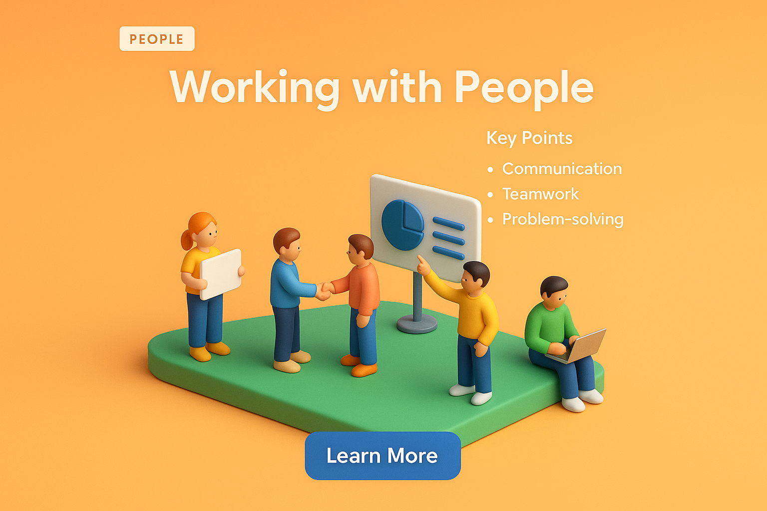 /Collection: /by davooda/Type: PNG/A 3D illustration showing a group of miniature figures engaged in teamwork activities. The vibrant colors and simple design create a playful yet professional atmosphere, emphasizing communication and collaboration.