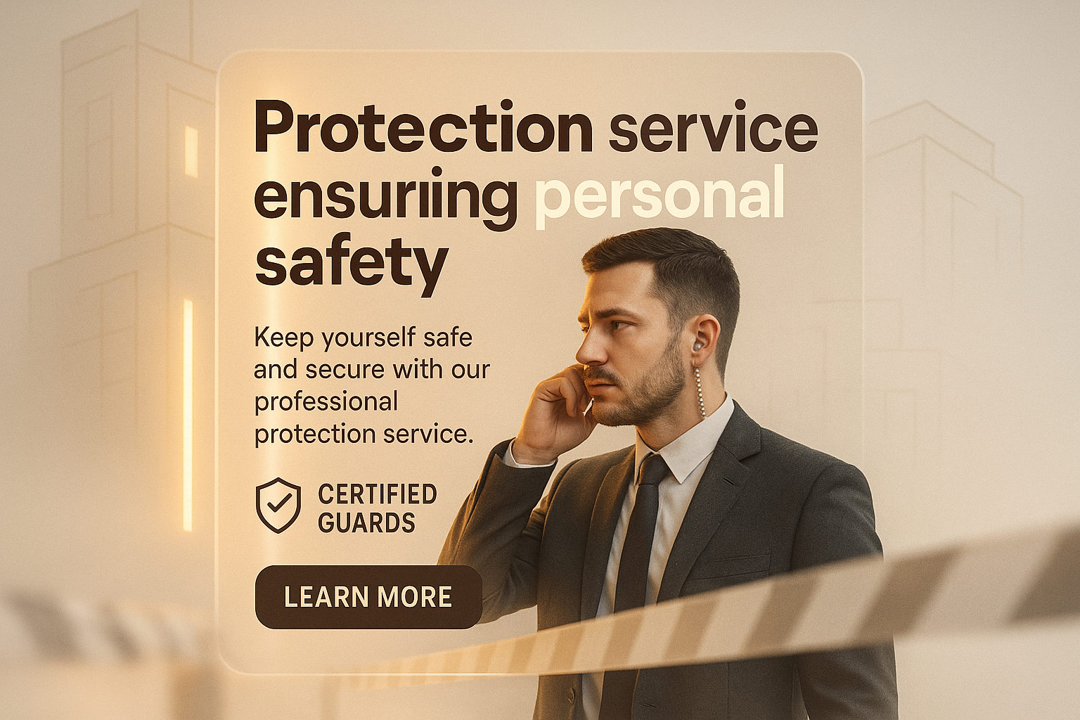 /Collection: /by davooda/Type: PNG/Engaging promotional graphic for personal safety services, featuring a professional individual on a call. Designed for use in digital marketing to attract clients seeking security solutions.