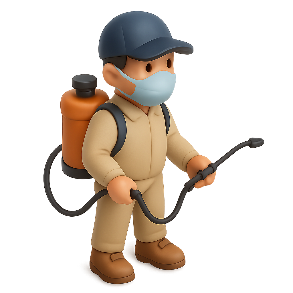 A 3D icon depicting a pest control technician wearing a mask and cap, holding a sprayer. The design features a transparent background and a three-quarter view.