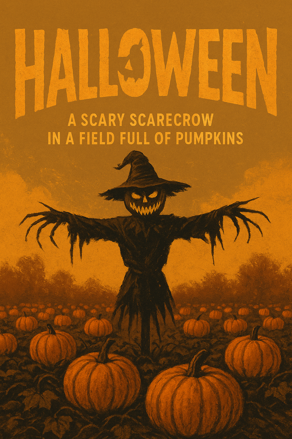 A spooky Halloween illustration showcasing a menacing scarecrow in a pumpkin field, perfect for seasonal promotions or Halloween events.