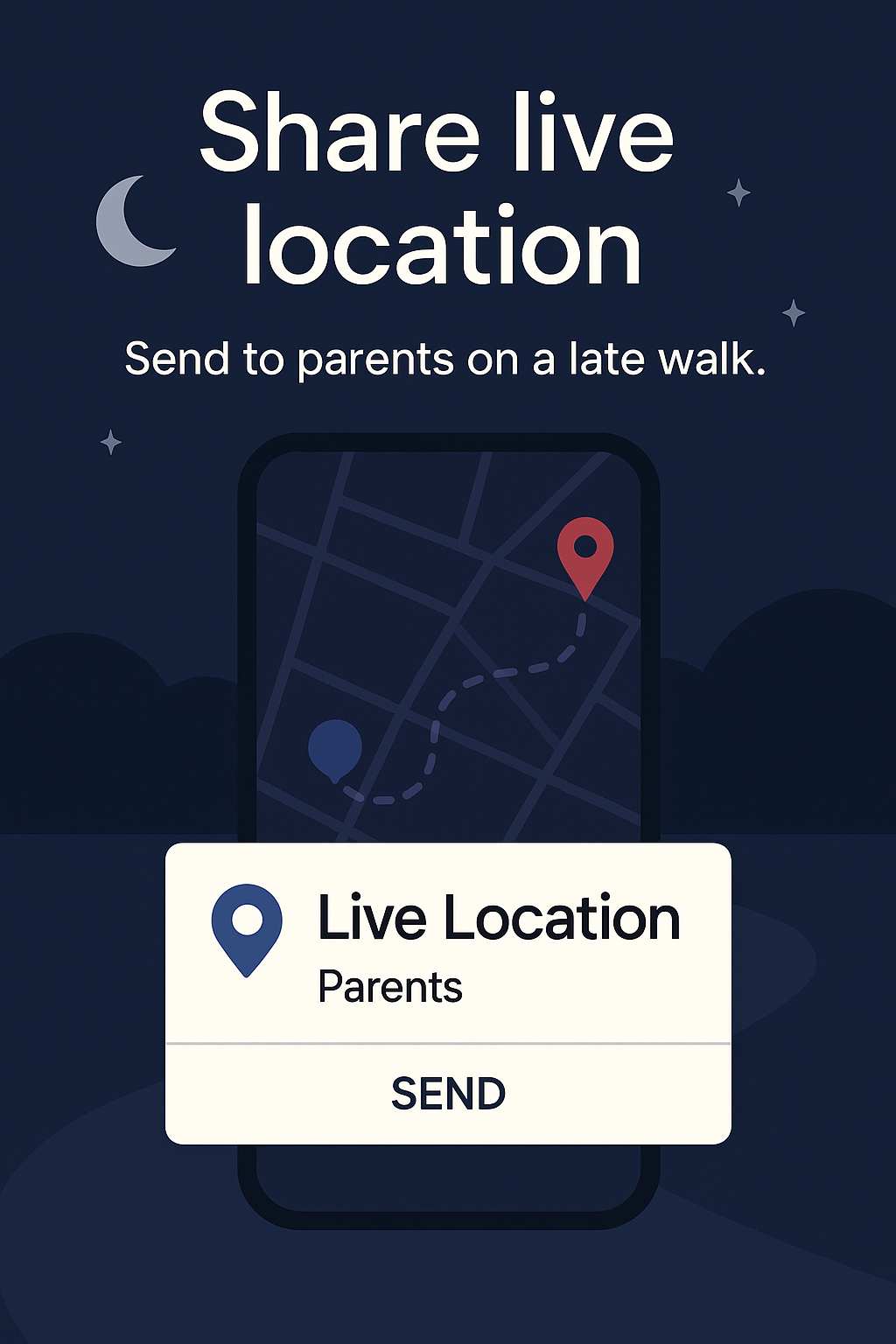Modern mobile app interface design showcasing live location sharing feature. The dark background and simple layout enhance usability, targeting parents for safety during evening walks.