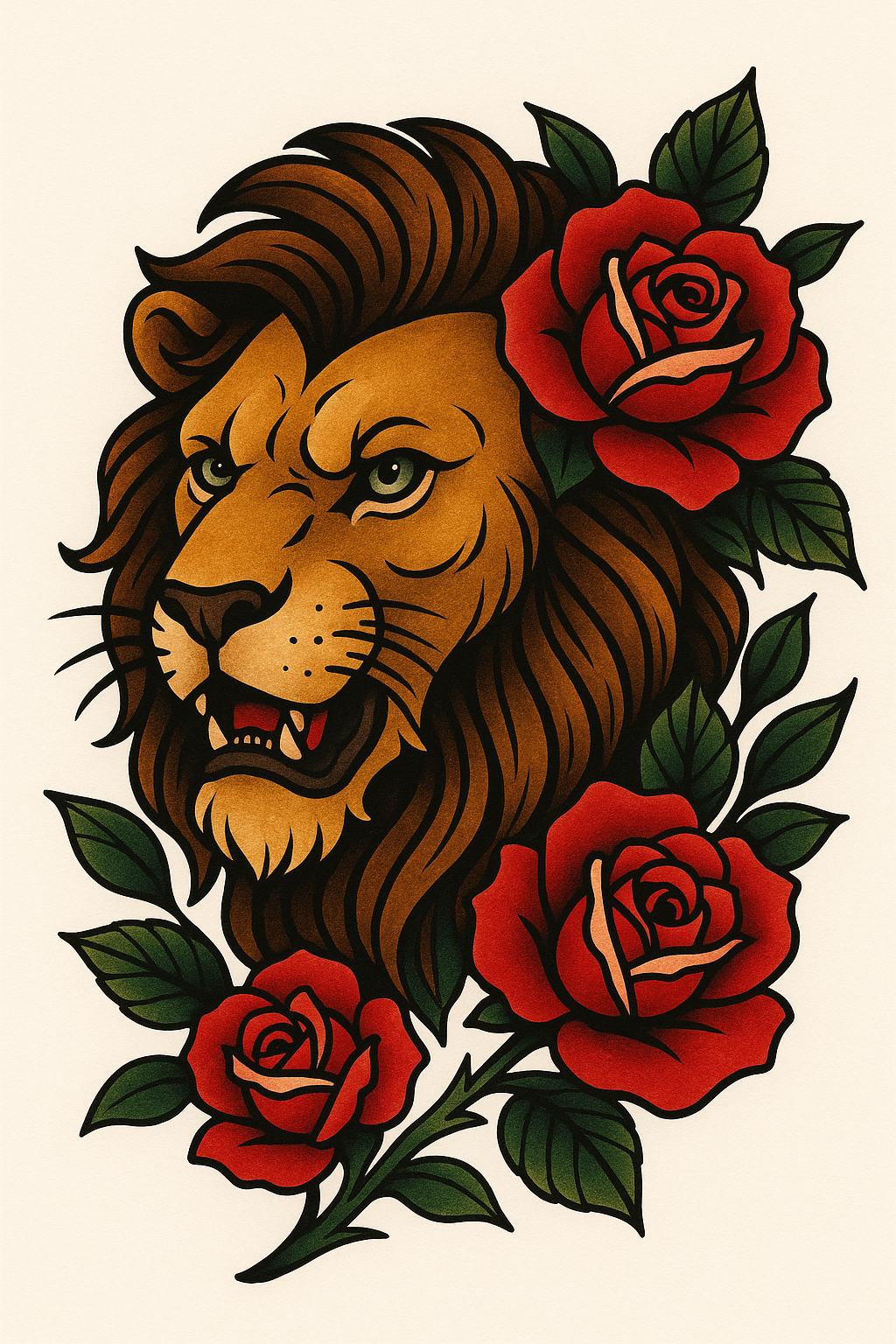Vivid tattoo design showcasing a fierce lion's head surrounded by vibrant red roses, ideal for tattoo enthusiasts and artists. The style combines traditional and illustrative elements.