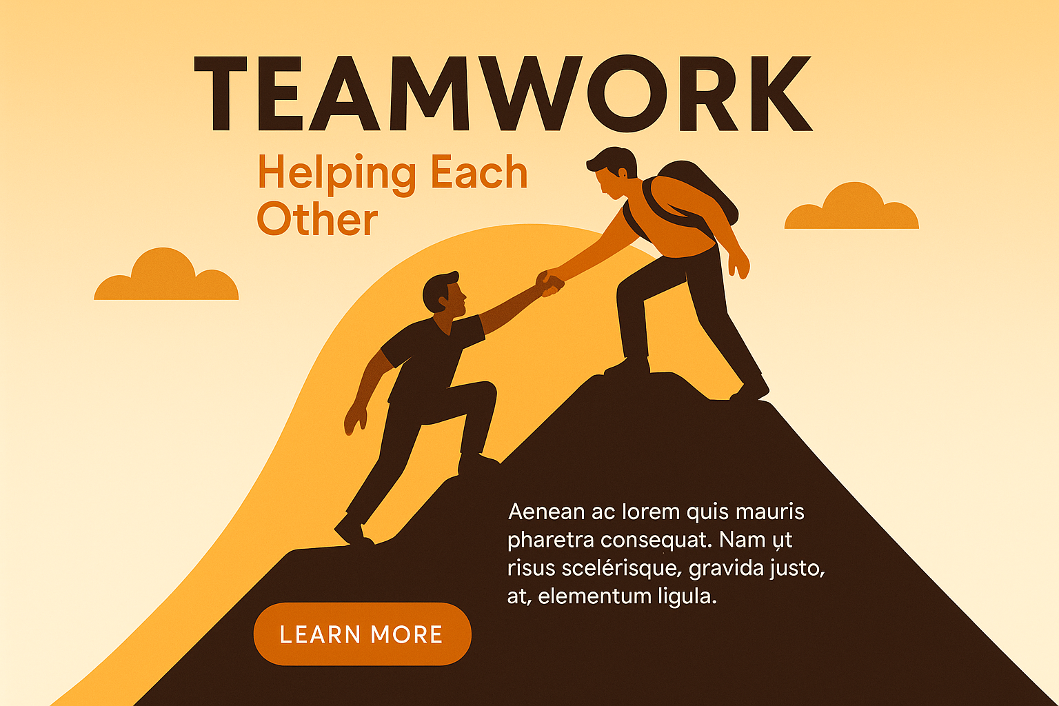 /Collection: /by davooda/Type: PNG/An engaging illustration depicting a teamwork theme, where one man helps another reach the mountain top. The design features a gradient background with geometric shapes and action buttons for a professional look.