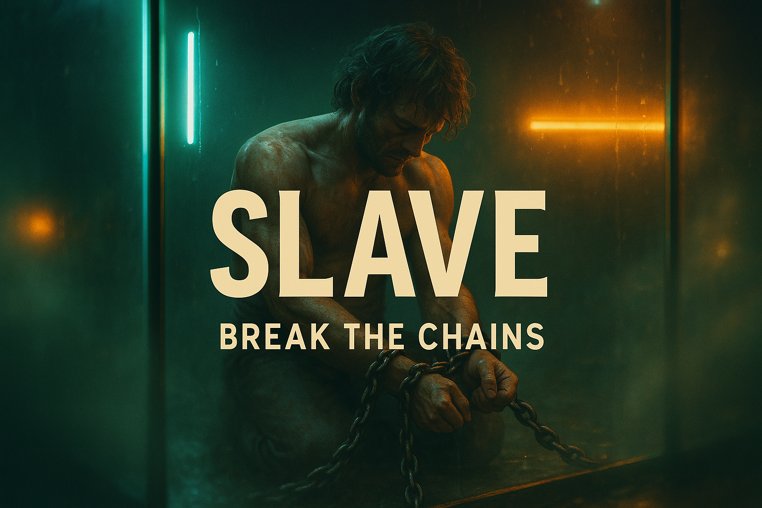 The image depicts a powerful scene of a chained figure in a glass enclosure, surrounded by neon lights that create an ethereal atmosphere. The text 'SLAVE' stands out, urging viewers to 'Break the Chains'.