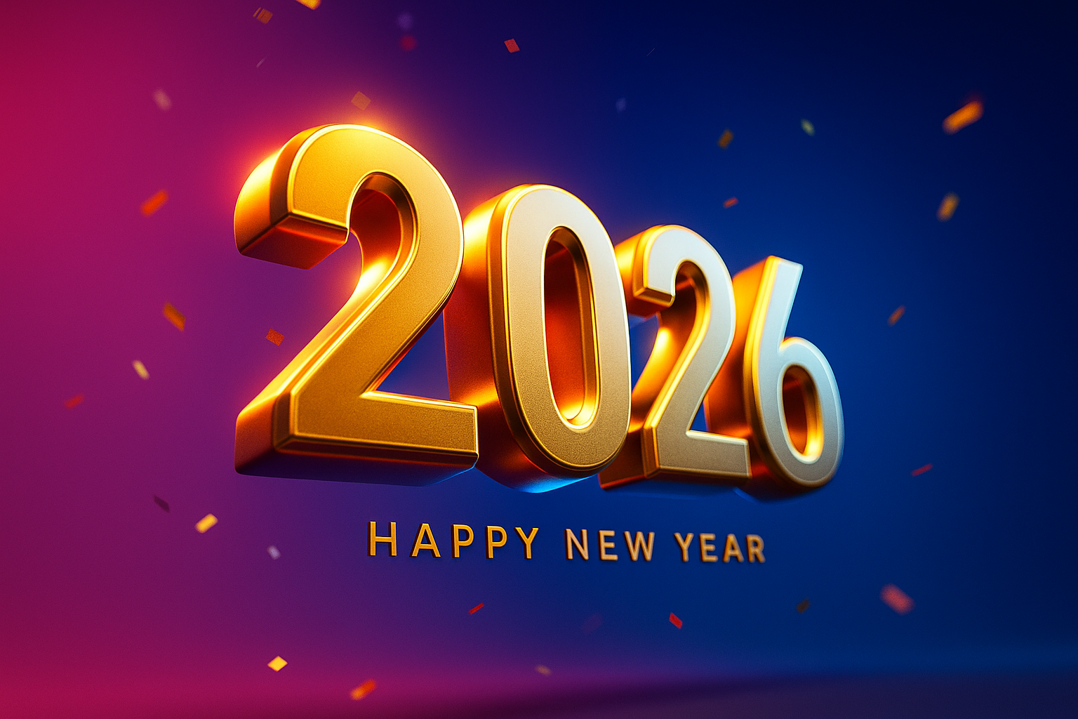 /Collection: /by davooda/Type: PNG/A luxurious design featuring golden numbers '2026' with 'Happy New Year' text. The background has a smooth gradient, contrasting vibrant colors, and dynamic lighting.