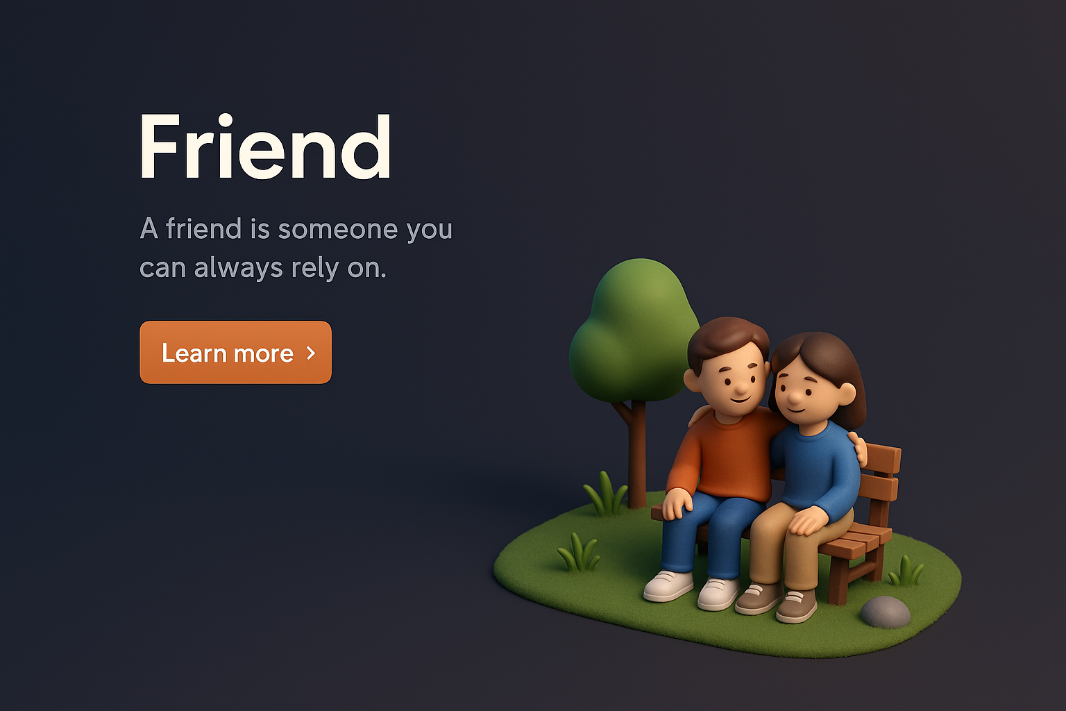 A delightful 3D representation of two friends sitting together on a bench, emphasizing companionship. The dark gradient background enhances the vibrant scene, showcasing a simple yet engaging design.