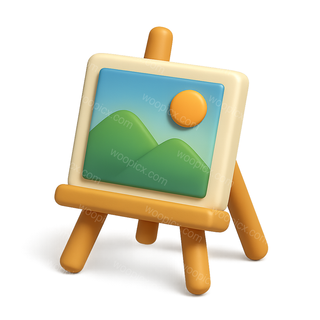 A stylized 3D icon depicting a scenic landscape featuring green mountains and a sun, set on a small easel. The design emphasizes a matte finish and volumetric feel.