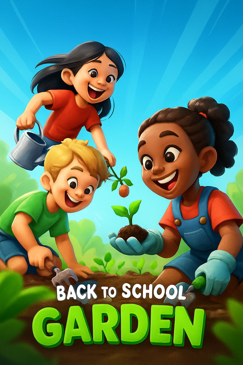 /Collection: /by davooda/Type: PNG/A lively scene of children gardening in a school garden, showcasing their enthusiasm for back-to-school activities. The illustration features bright colors and dynamic elements that create an engaging atmosphere.
