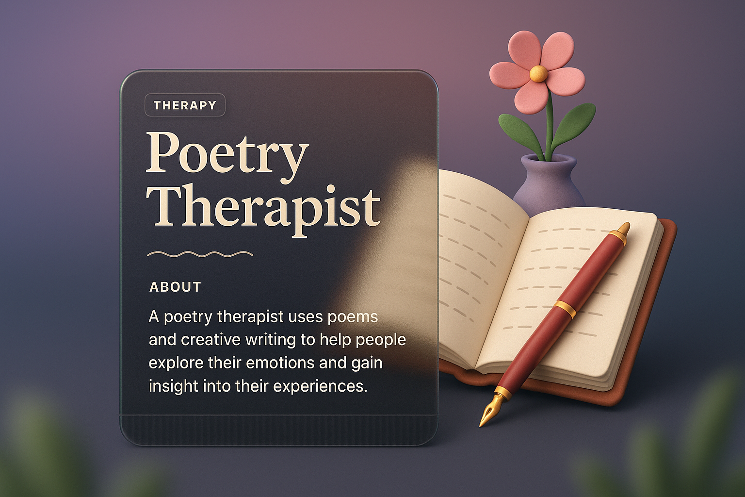 /Collection: /by davooda/Type: PNG/A visually striking 3D illustration featuring a 'Poetry Therapist' block with an elegant design. The background transitions from a gradient to a solid color, complemented by an open book and a flower vase, embodying creativity and emotional exploration.