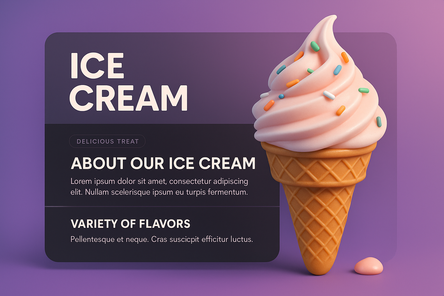 /Collection: /by davooda/Type: PNG/A vibrant 3D illustration of an ice cream cone topped with colorful sprinkles. Accompanied by a dark information block detailing flavors and descriptions, seamlessly integrated into the design.