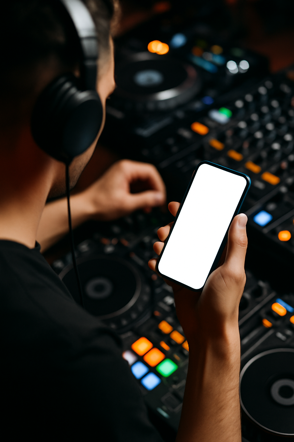 A DJ wearing headphones holds a blue phone with a blank screen while working at a control deck. The image captures a dynamic and engaging atmosphere from behind the DJ.