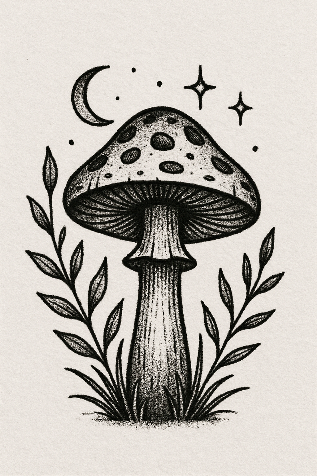 /Collection: /by davooda/Type: PNG/This image features a detailed black and white illustration of a mushroom surrounded by leaves and celestial elements like a moon and stars. It is suitable for art prints or nature-themed designs.