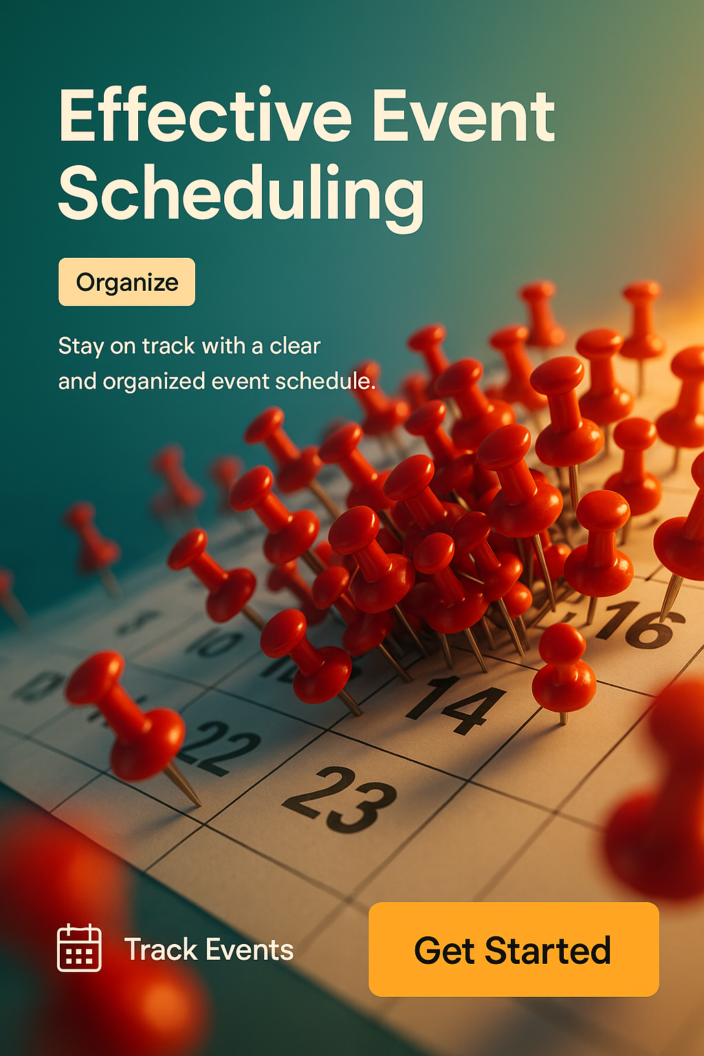 /Collection: /by davooda/Type: PNG/This is a promotional graphic emphasizing effective event scheduling with a calendar and push pins. Designed for event planners and organizers, it combines vibrant colors and a modern layout.