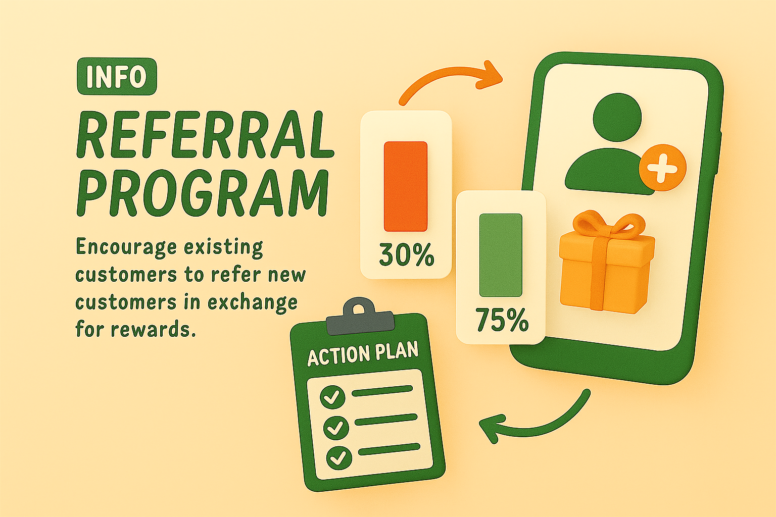 Colorful infographic illustrating a referral program, highlighting customer incentives and an action plan, designed for marketing purposes.