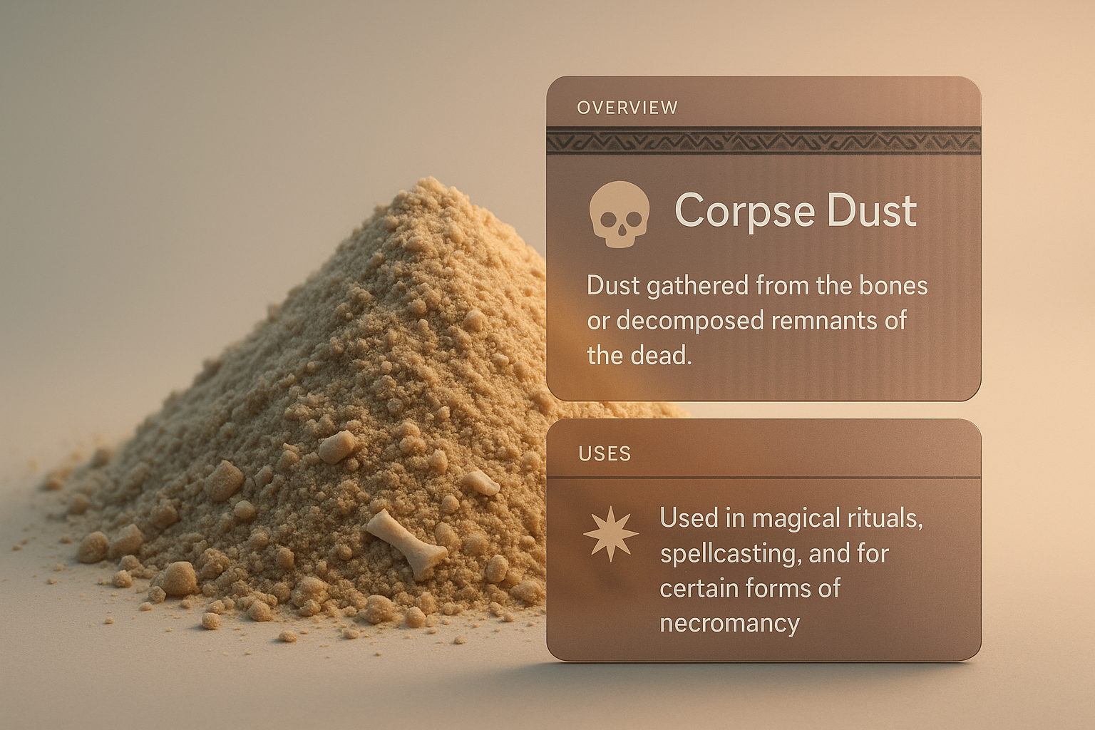 /Collection: /by davooda/Type: PNG/A detailed 3D illustration of corpse dust, featuring two integrated blocks with information. The design includes a gradient background and a cohesive layout that enhances readability.