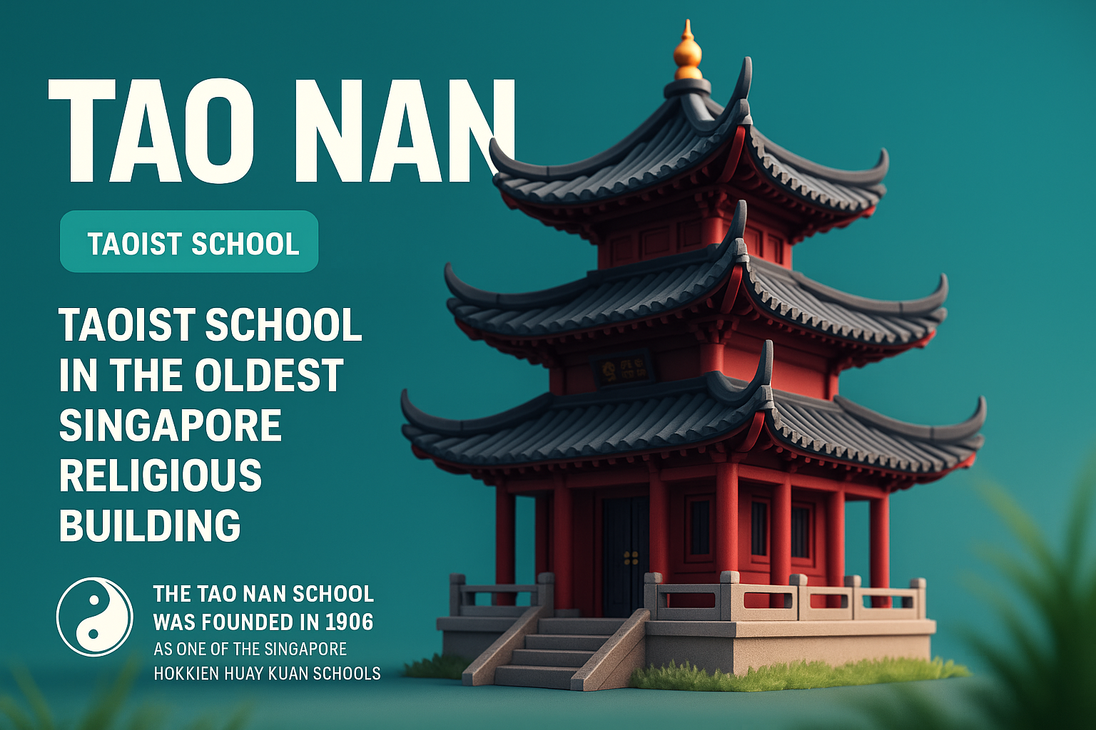 A striking 3D illustration featuring the Tao Nan School, the oldest religious building in Singapore, highlighted against a smooth gradient background.