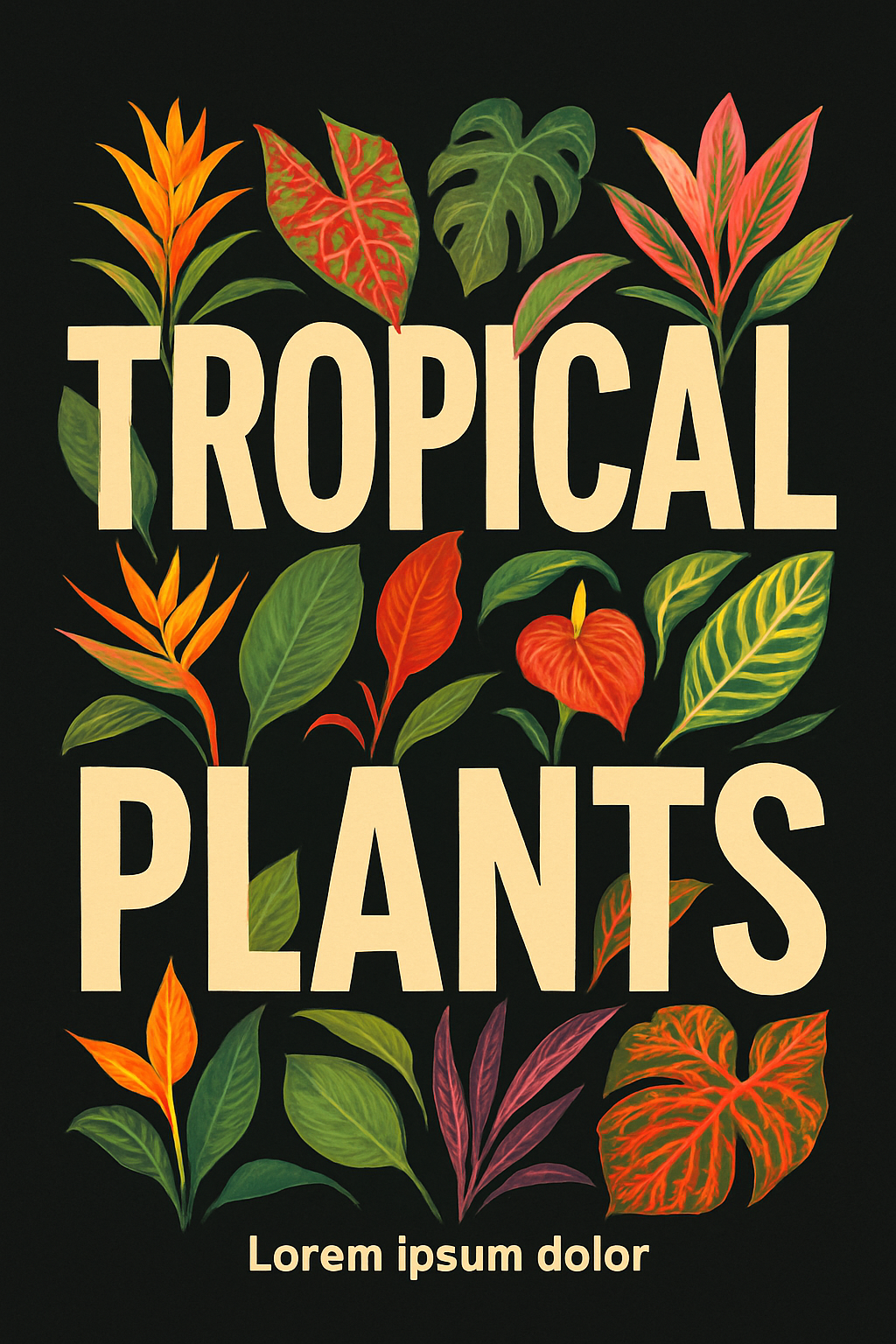 An artistic illustration featuring a variety of tropical plants with bold typography, suitable for botanical prints or nature-themed decor.