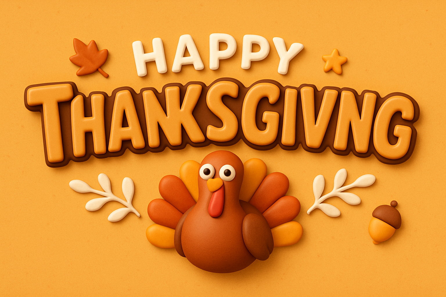 Festive Thanksgiving greeting image featuring 3D text and a turkey illustration, suitable for holiday cards or social media posts.
