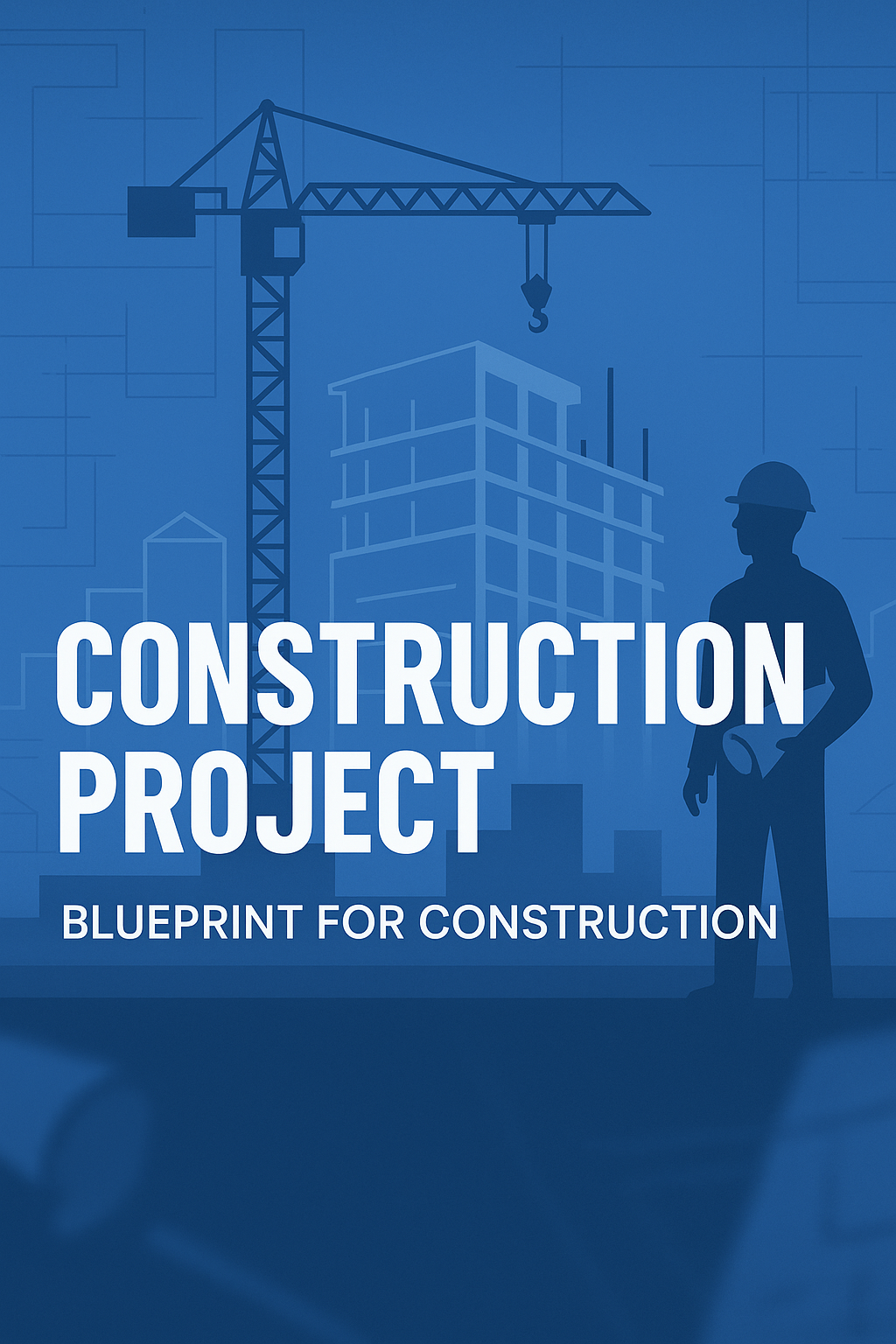 Stylized graphic representing a construction project theme, featuring a silhouette of a worker and a building blueprint background, ideal for construction-related marketing or presentations.