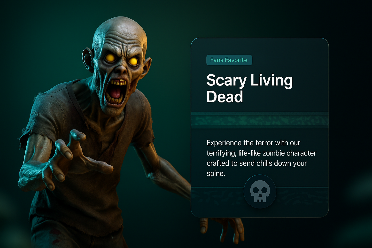 An intricately designed 3D zombie with glowing eyes, posed dramatically against a gradient background, featuring a text block that enhances the theme of horror.